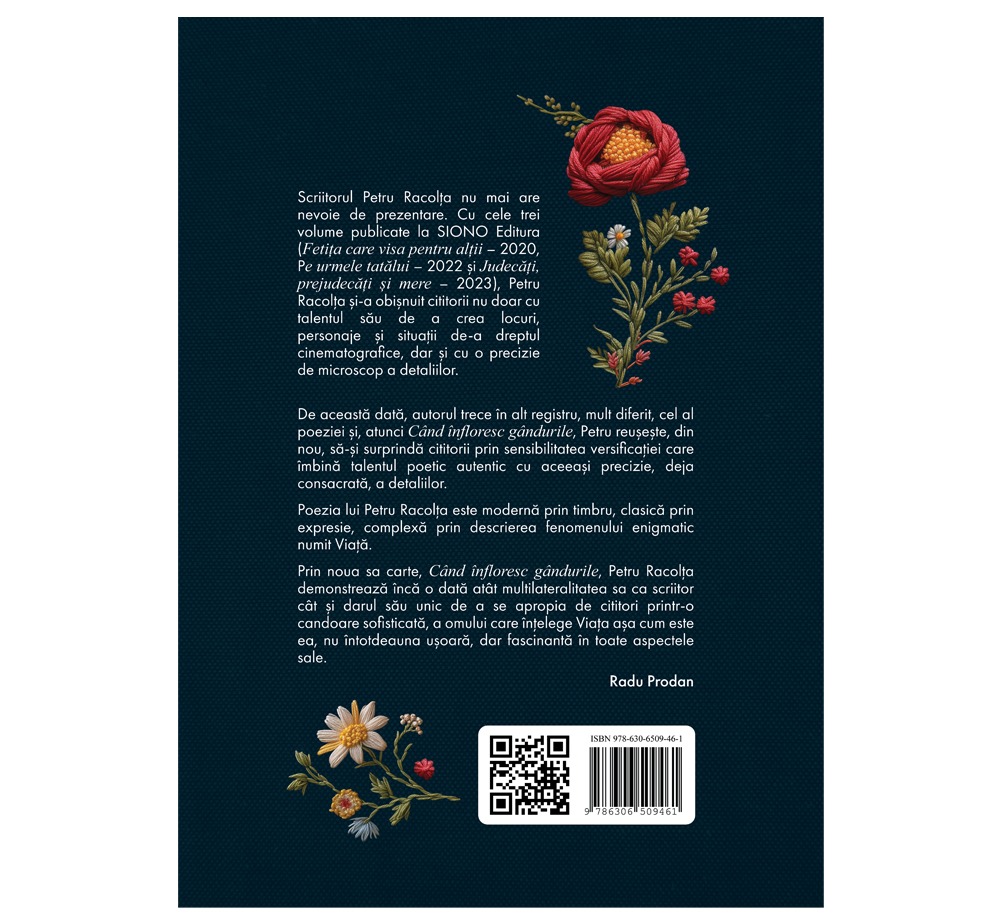 Prin noua sa carte, Când înfloresc gândurile, Petru Racolța demonstrează încă o dată atât multilateralitatea sa ca scriitor cât și darul său unic de a se apropia de cititori printr-o candoare sofisticată, a omului care înțelege Viața așa cum este ea, nu întotdeauna ușoară, dar fascinantă în toate aspectele sale.