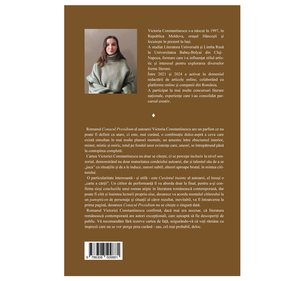 Romanul Conacul Presidium al autoarei Victoria Constantinescu are un parfum ce nu poate fi definit ca atare, ci este, mai curând, o combinație dulce-aspră a ceva care există simultan în mai multe planuri mentale, un amestec între zbuciumul interior, mister, mistic și oniric, totul pe fondul unor existențe care, uneori, se întrepătrund până la contopirea completă.