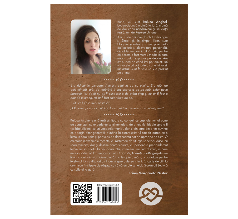 Raluca Anghel e o tanara scriitoare, cu condei, cu capitole numai bune de ecranizat, cu experiente sentimentale si de prietenie, ideale spre a fi ( pshi)analizate, cu un vocabular variat, dar si din care am prins cuvinte ce apartin altor generetii, punand la curent cititorul (sau cititoarea), cu o lume in care traim si poate nu ne dam seama cat de aproape ne este!