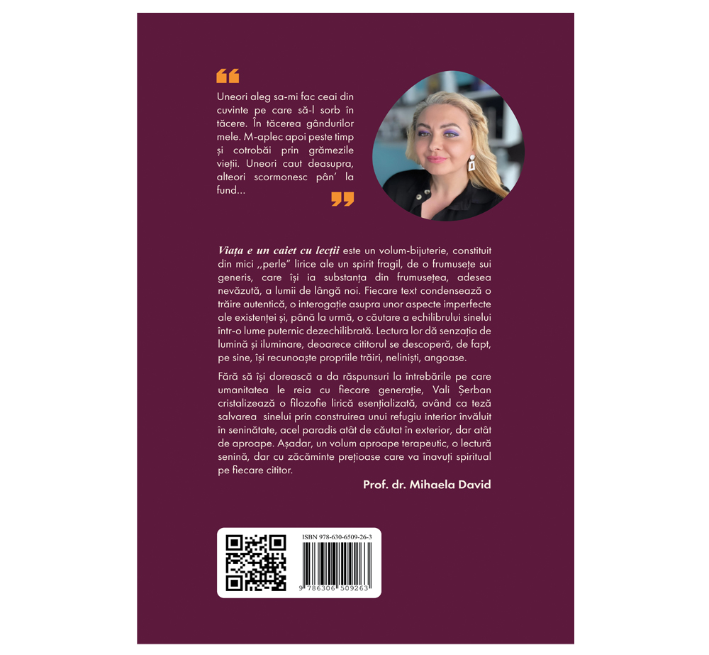Viața e un caiet cu lecții este un volum-bijuterie, constituit din mici ,, perle” lirice ale un spirit fragil, de o frumusețe sui generis, care își ia substanța din frumusețea, adesea nevăzută, a lumii de lângă noi. De fapt, autoarea Vali Șerban refuză cu obstinație să vadă răutatea din jur, deși dă dovadă de o luciditate pătrunzătoare, preferând să perceapă întâlnirile ei cu tristețea, malițiozitatea sau indiferanța brutală a oamenilor drept o lecție existențială, o treaptă a înălțării ei spirituale. Textele, creionate în jurul unei tematici diverse, iubirea, timpul, credința, dezamăgirea sunt parcă fulgurații spontane, ivite din tulburările interioare ale feminității ei complexe și au rolul cathartic de a înlesni înțelegerea profundă a vieții. Fiecare text condenseaza o trăire autentică, o interogație asupra unor aspecte imperfecte ale existenței și, până la urmă o căutare a echilibrului sinelui într- o lume puternic dezechilibrată. Lectura lor dă senzația de lumină și iluminare, deoarece cititorul se descoperă ,de fapt, pe sine, își recunoaște propriile trăiri, neliniști, angoase.
